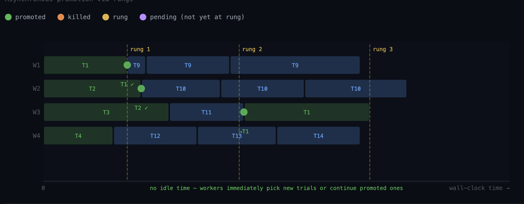Provisionally promote trials on rungs, and then demote them. Works better than waiting on syncronization. For example: